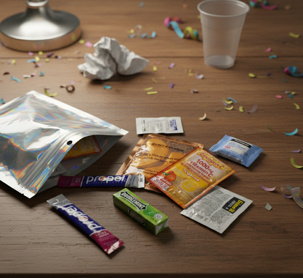 Electrolytes, Advil, eye masks, make-up remover, antacid, and vitamin C - everything you need to bounce back.
